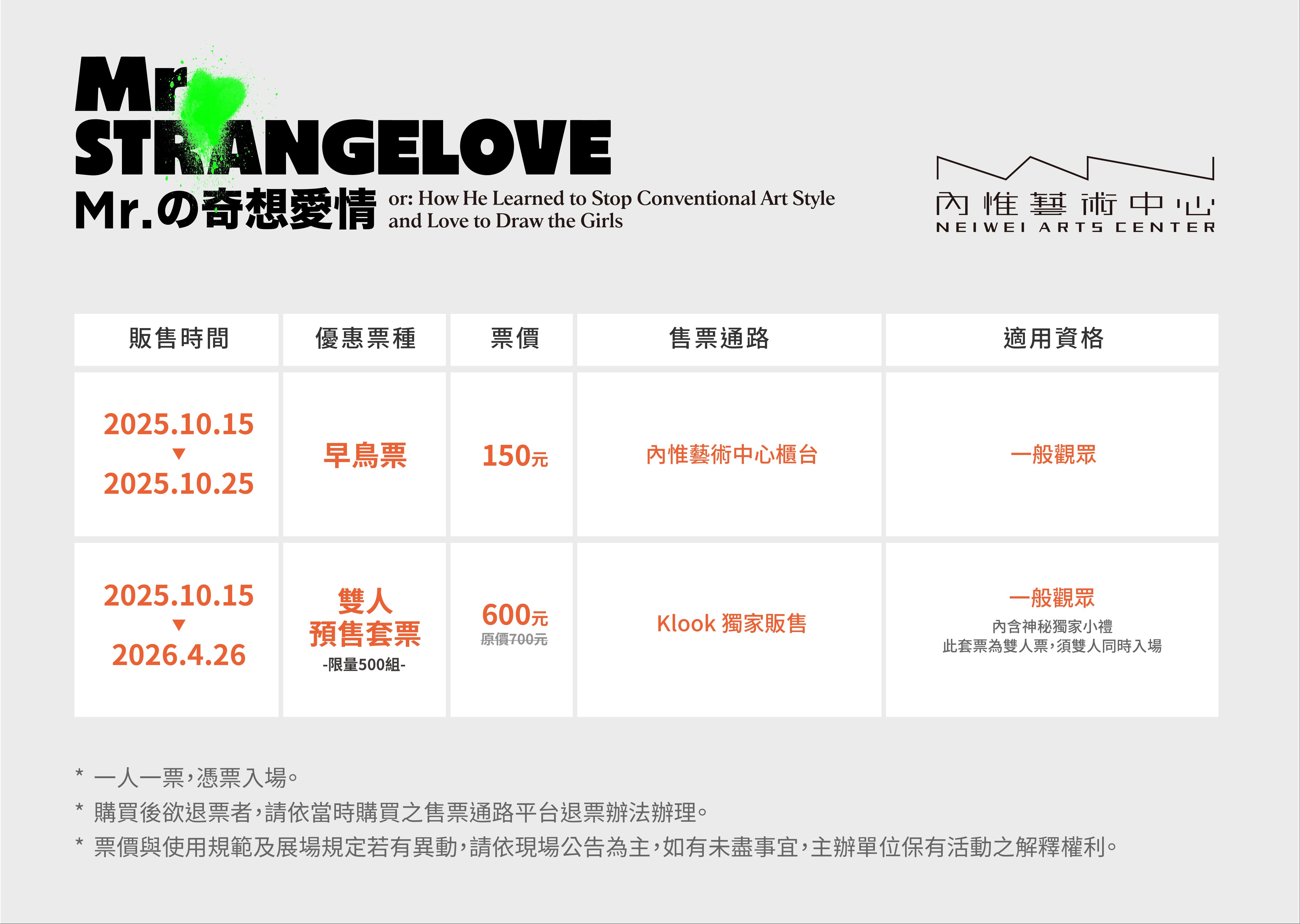 本館《馮.沃爾夫的花園堡壘》與內惟藝術中心《Mr. の奇想愛情》兩展早鳥票($150/張,原價$300)將於10月15日至10月25日限時販售,《馮.沃爾夫的花園堡壘》特展早鳥票可至本館售票中心、ibon售票系統購買;《Mr. の奇想愛情》早鳥票則於內惟藝術中心售票櫃台現場獨家販售,全票、優惠票種自10月26日起全通路同步啟售。
