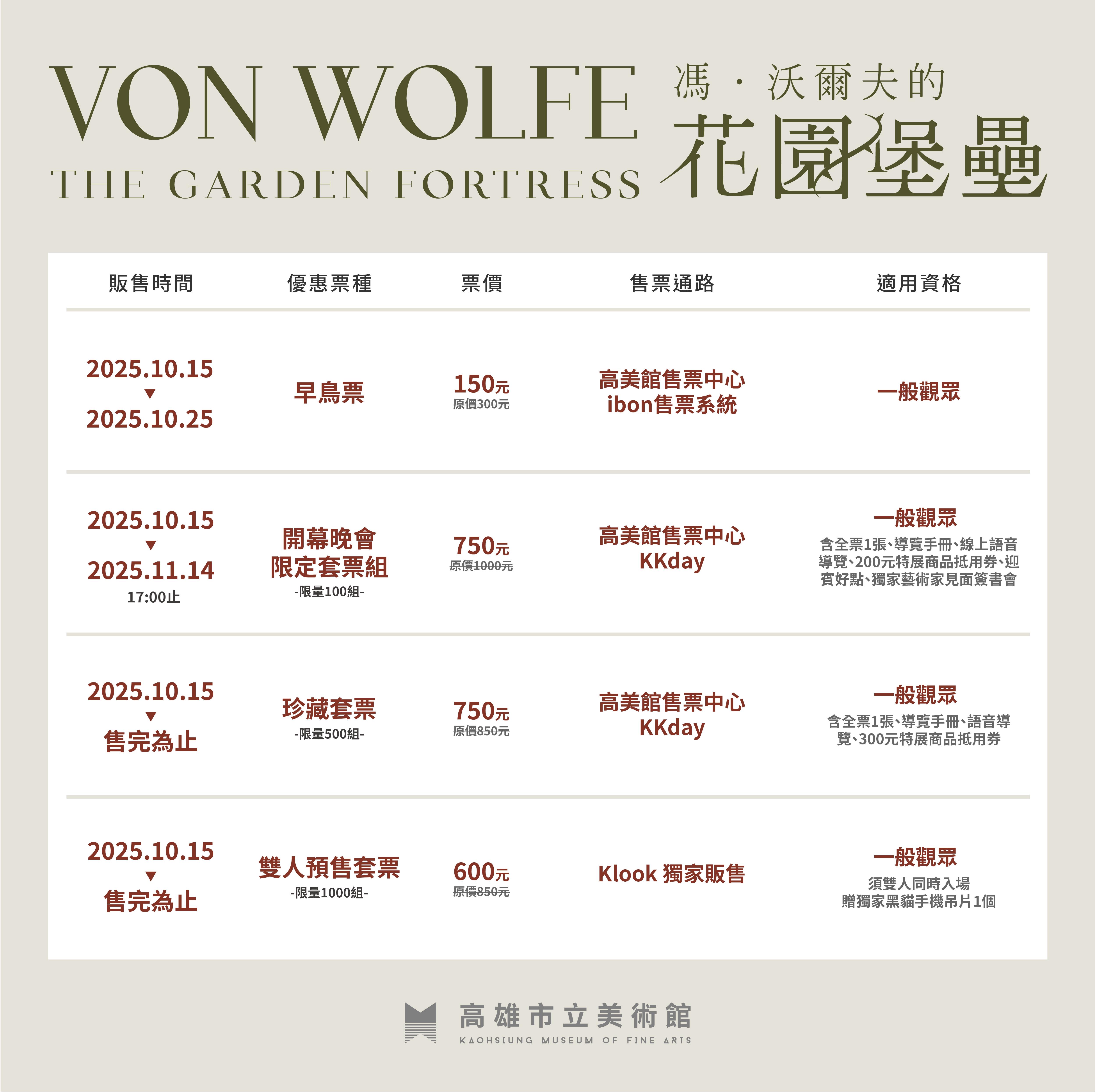 特展珍藏套票包含《馮.沃爾夫的花園堡壘》入場門票、導覽手冊、語音導覽以及300元特展商品抵用券各一,適合看完展想購買周邊商品收藏的觀眾。售價750元,限量500組(售完為止),10月15日起於高美館售票中心、KKday販售。