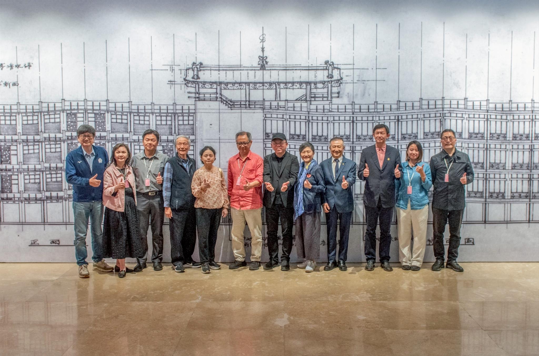 《地域主義的先行者:陳仁和百年+3建築紀念大展》展覽開幕式,高美館館長顏名宏、策展人代表徐明松、陳仁和家屬代表林世敏、高雄建築師公會理事長羅必達與眾多貴賓一同合照。