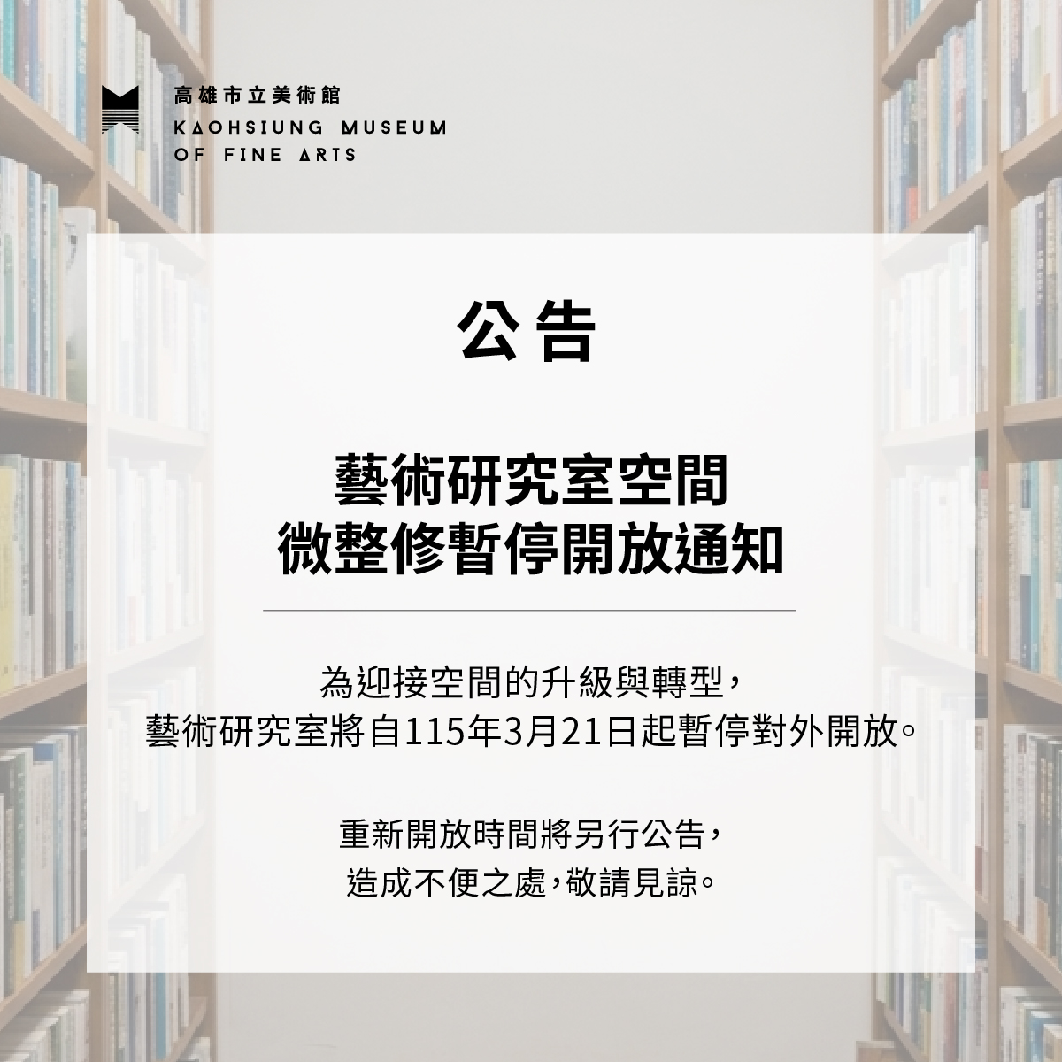 為迎接空間的升級與轉型,藝術研究室將自115年3月21日起暫停對外開放,重新開放時間將另行公告。