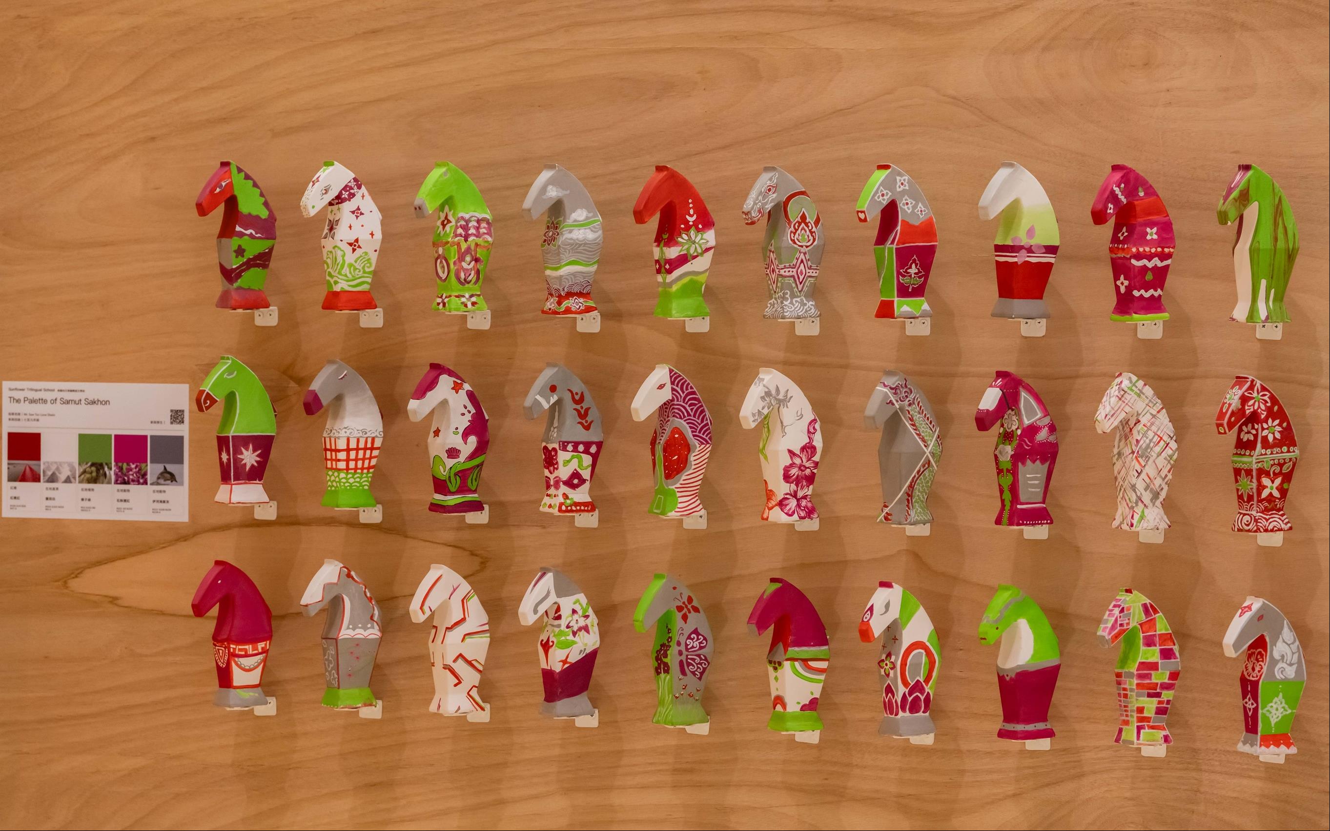 本次「感動馬」素坯原型由莊普設計,他以西洋棋中的「馬」為靈感,透過俐落直線表達馬的堅毅、弧線展現速度感,底部的梯形馬蹄則象徵蓄勢待發的動能,此次在外型上保留了較多著色面,讓孩子們的創意能夠盡情揮灑。此外,《感動馬》美感教育觸角亦持續向外延伸至國際,除高雄市、屏東縣、嘉義市、嘉義縣、臺南市、臺東縣、澎湖縣等7縣市共36所國中小學,以及去年(2025)合作的泰國 Sunflower Trilingual School 外,今年更首度邀請到日本熊本市立天明中學參與。透過「色彩地理學」概念,各校教師帶領學生進行社區踏查,採集獨特的在地文化色彩,在《感動馬》一展中,共同展出逾900件「小感動馬」彩繪作品,呈現臺、泰、日三國學子們多元的色彩觀察及豐沛的創作能量。