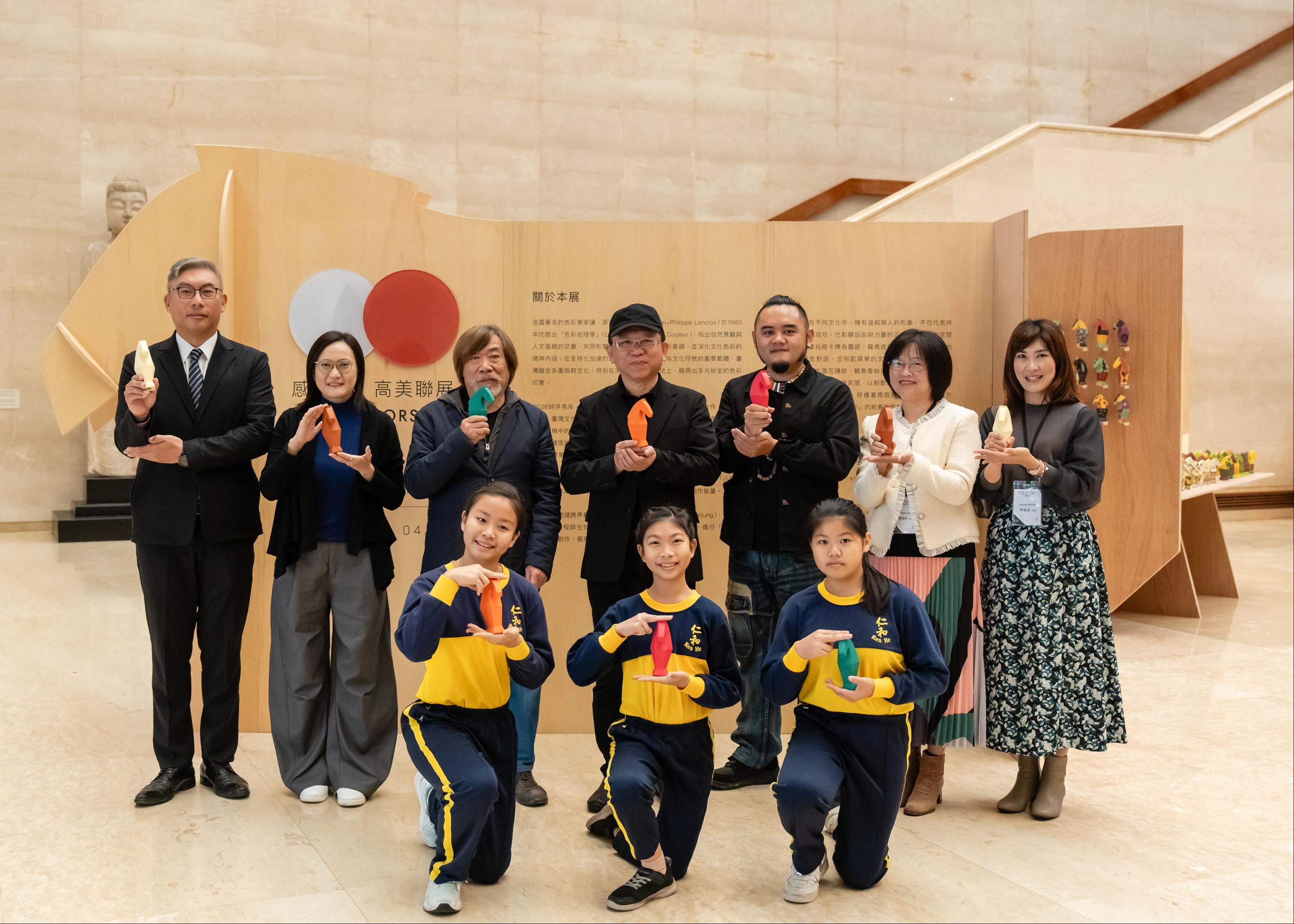 高美館《感動馬》本(6)日開展,藝術家莊普(左1)、高美館館長顏名宏(左2)、藝術家磊勒丹.巴瓦瓦隆(右1)與仁和國小參展學生代表共同合照。