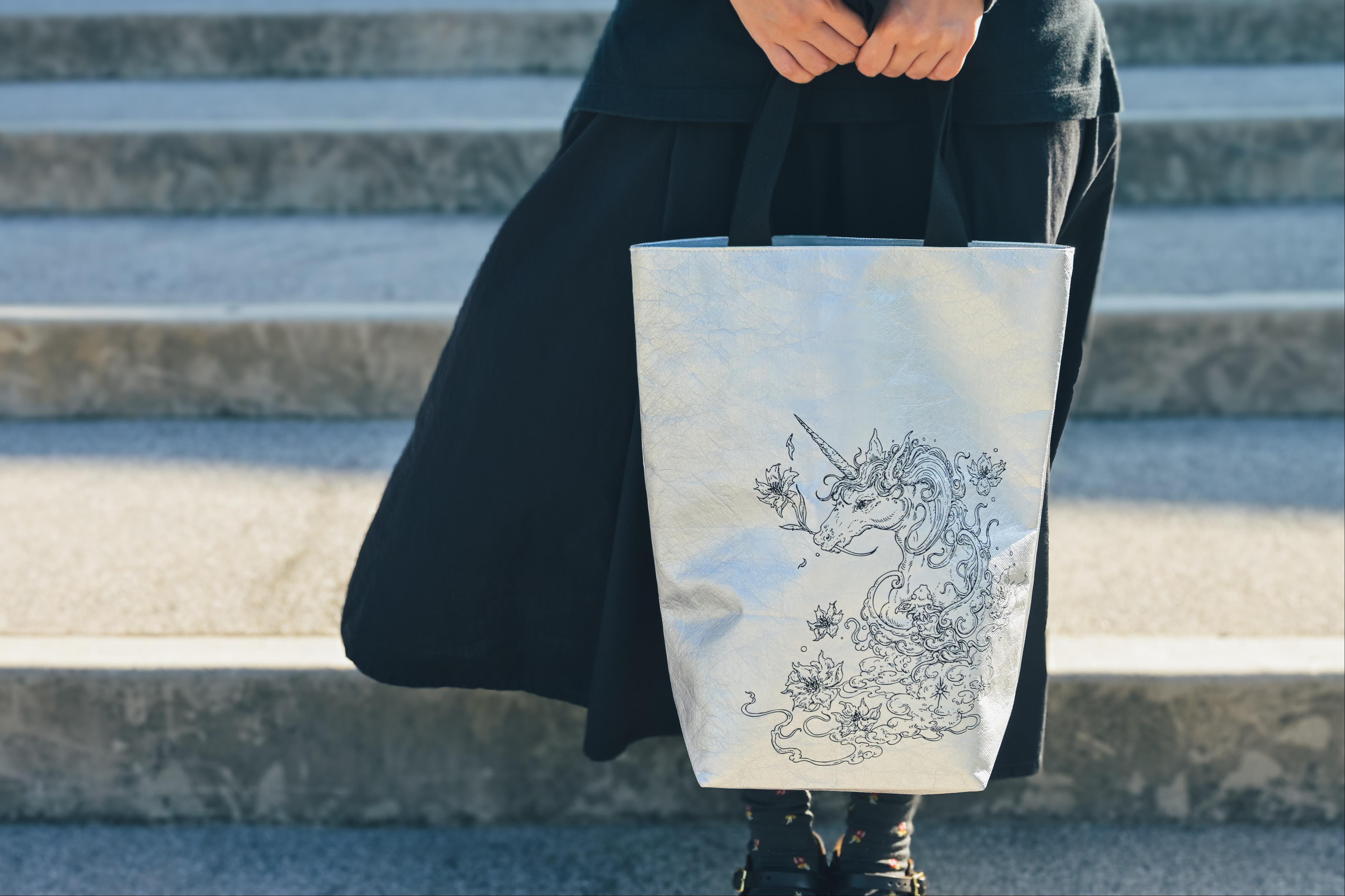高美書屋《春之頌歌》杜邦紙托特包,藝術家陳絲穎以獨角獸搭配蝙蝠、鳳凰山茶花等吉祥元素進行創作,不限金額消費即可加購獲得。