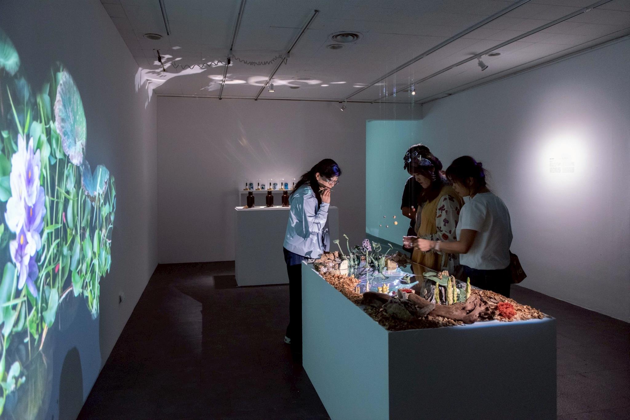 作品《我們水中所見》延伸自《連結失落的風景》與《與布袋蓮的共修關係》兩件作品,結合陶瓷雕塑、影像、香氛等元素,探索人類與「非人世界」的關係。