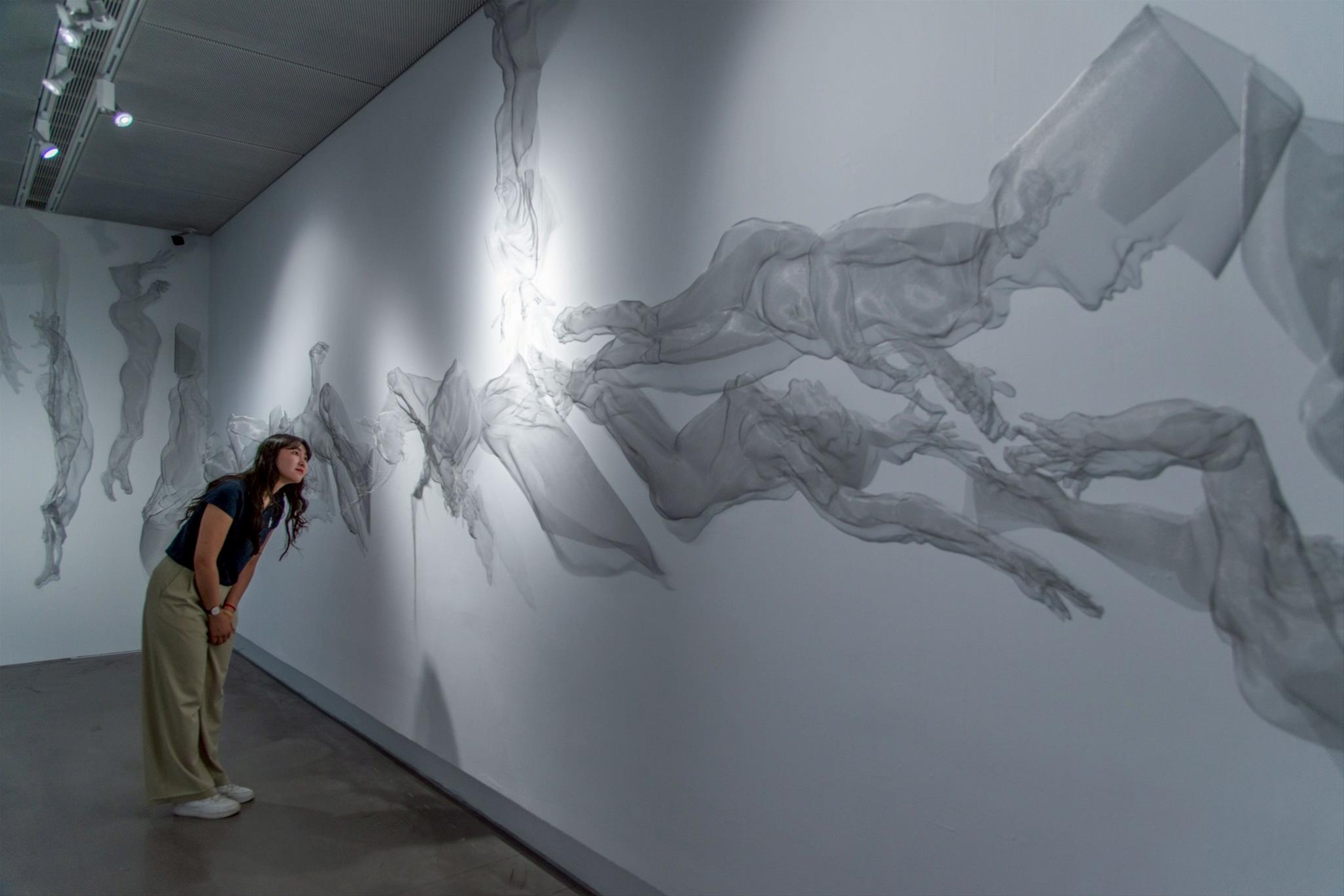 本館《快樂島-日常的史詩》展場一隅,圖為朴成泰以鋁絲網為媒材創作的《天界之花》系列作品。