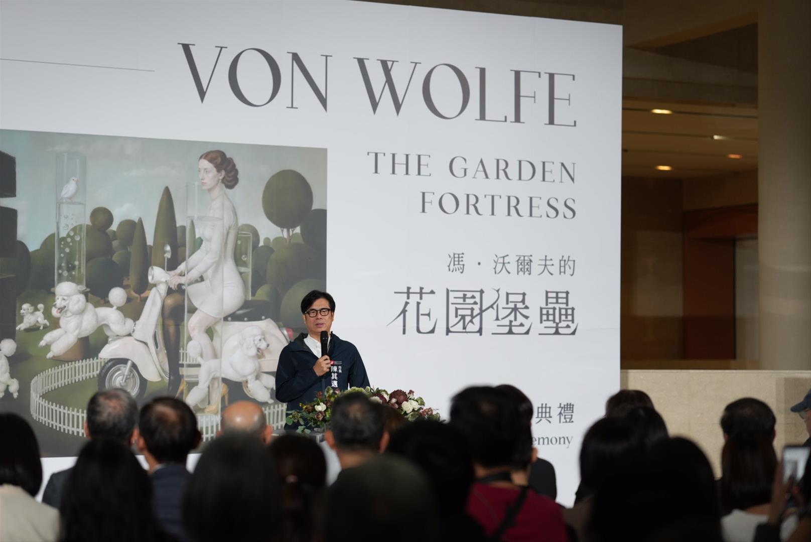 高雄市長陳其邁今(14)出席開幕式,他特別感謝文化部的支持,以及柯珀汝女士、高雄市大愛扶輪社、楠弘集團、國際扶輪3510地區等民間企業、團體共襄盛舉,促成特展順利開幕。陳其邁強調,本館能作為藝術家馮.沃爾夫在亞洲展覽最重要且最大規模的展出地點,是高雄的驕傲。他盛讚馮.沃爾夫不僅是一位藝術家,更是一位哲學家,其作品融合了古今中外大師的多元風格,並運用科技解構重組藝術語彙,有著震懾人心的力量,他並感謝藝術家針對台灣、高雄進行了深入的研究,發展出〈花園堡壘〉這幅精彩作品。陳其邁期待在高雄接軌國際的途中,以文化回應科技,以藝術詮釋未來,成為一座具有豐沛創造力的城市。