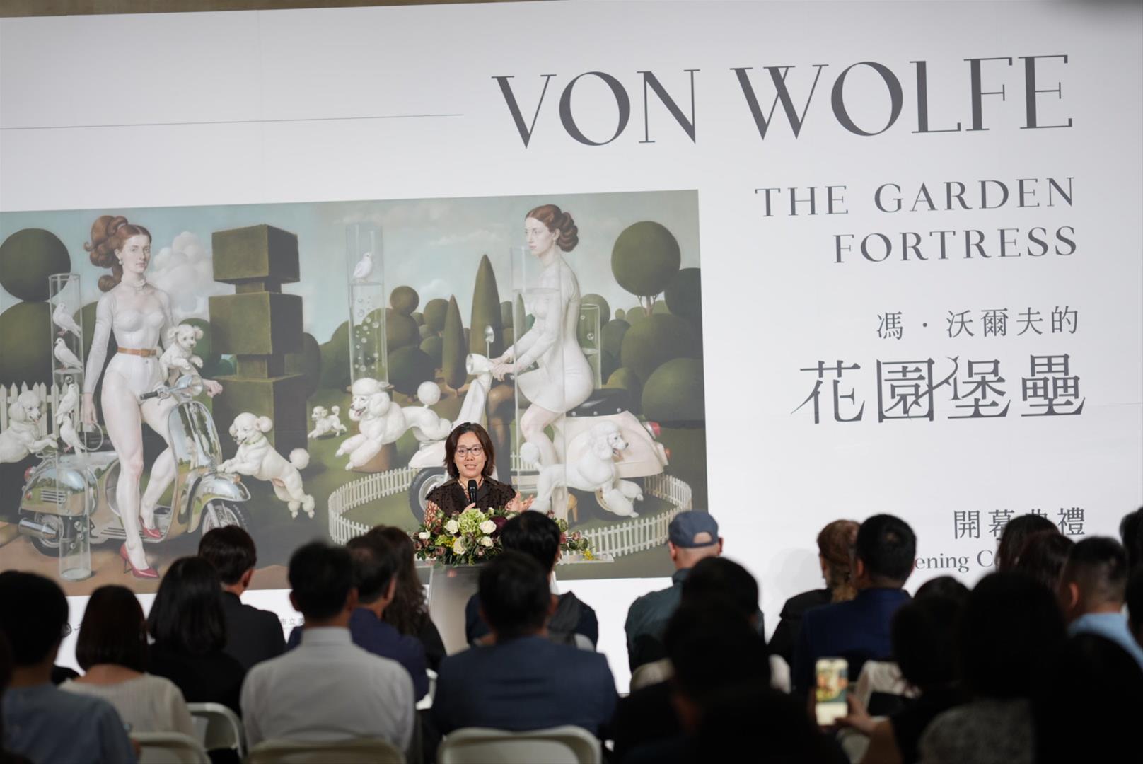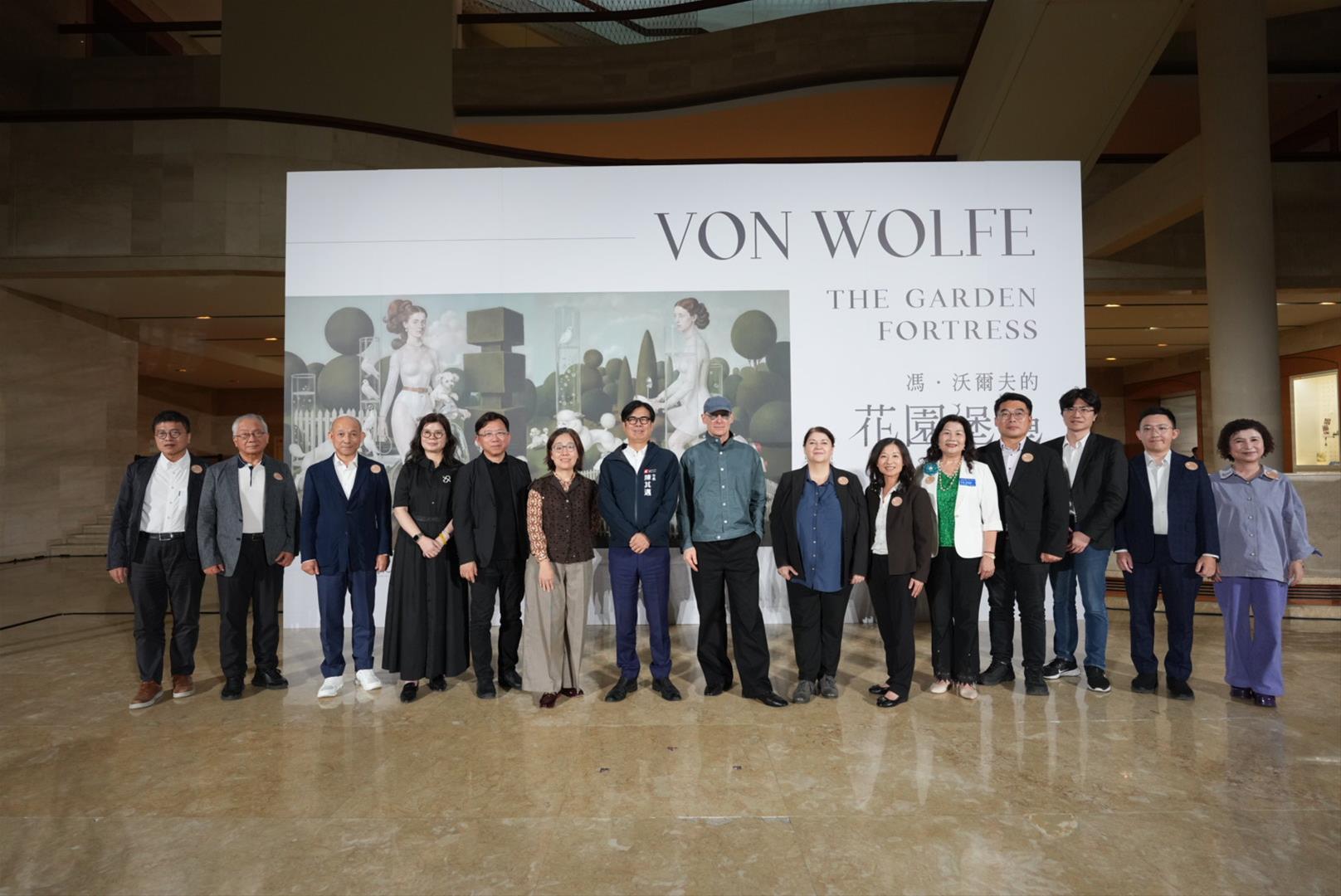 高雄市立美術館(下稱本館)國際特展《馮.沃爾夫的花園堡壘》(Von Wolfe: The Garden Fortress)11月14日舉行開幕預展,文化部次長王時思、高雄市長陳其邁、高雄市議員邱俊憲、英國文化協會署長蘇珊(Susan Milner)、英國在台辦事處新聞處處長林君玲、英國藝術家馮.沃爾夫(Von Wolfe)、高雄市文化局長王文翠與本館館長顏名宏共同出席,正式揭曉馮.沃爾夫近70件經典作品。本展為馮.沃爾夫首次在亞洲的大型回顧展,精選其早期跨文化創作,並聚焦他近年來結合AI科技與油畫的創新實驗,展覽明(15)起至2026年4月19日於本館101-103展覽室隆重登場。