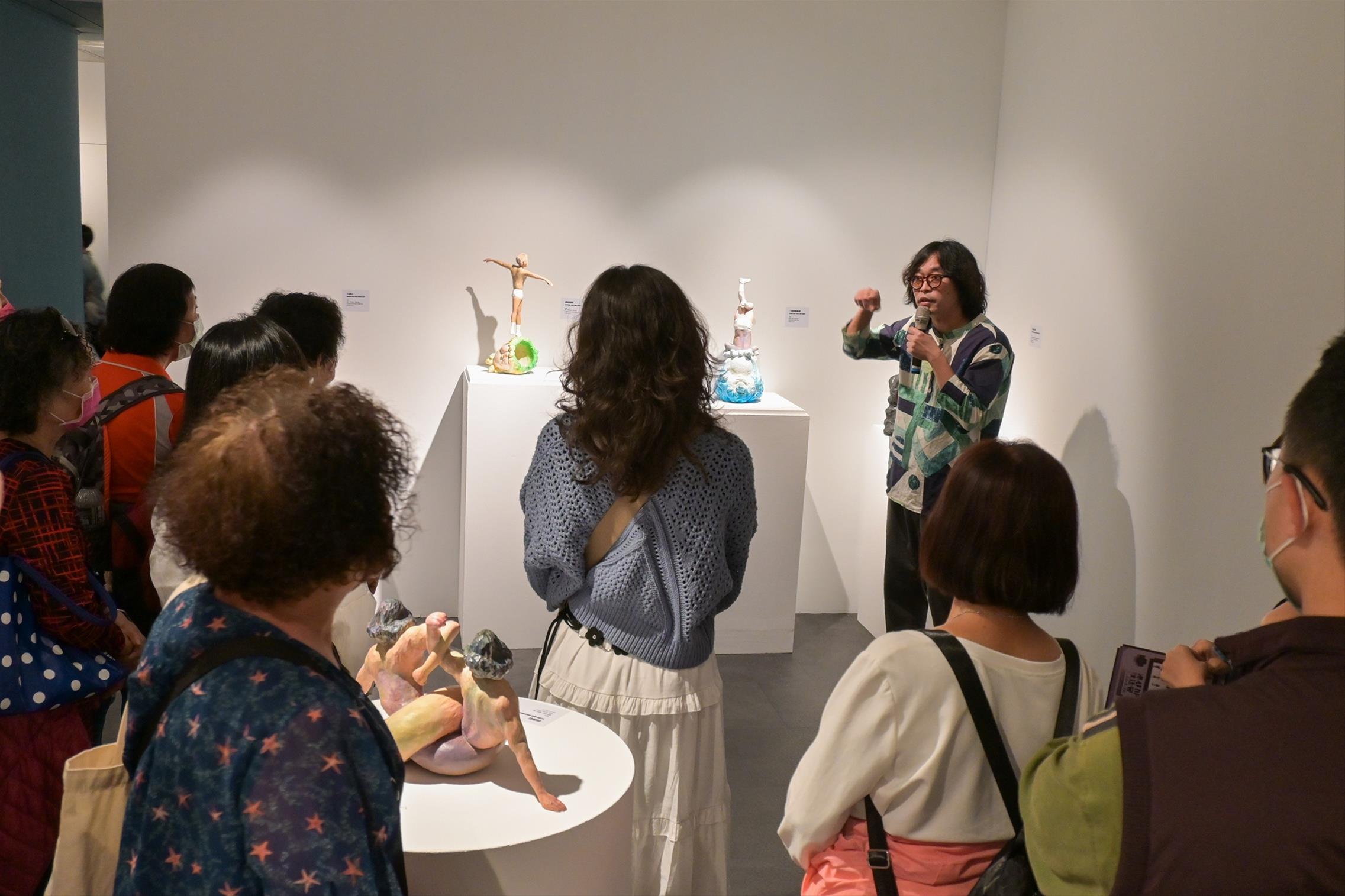 藝術家陳廷晉於展覽開幕時為民眾導覽作品。