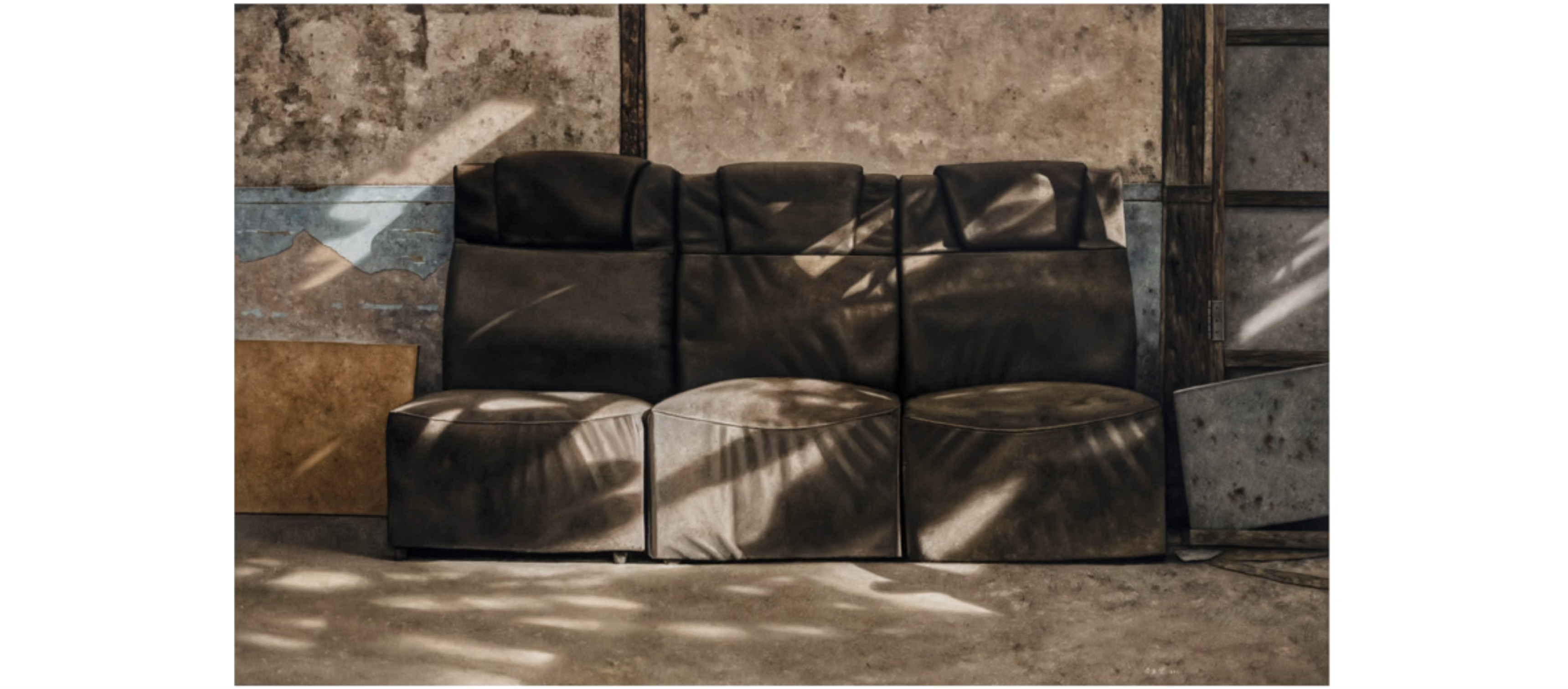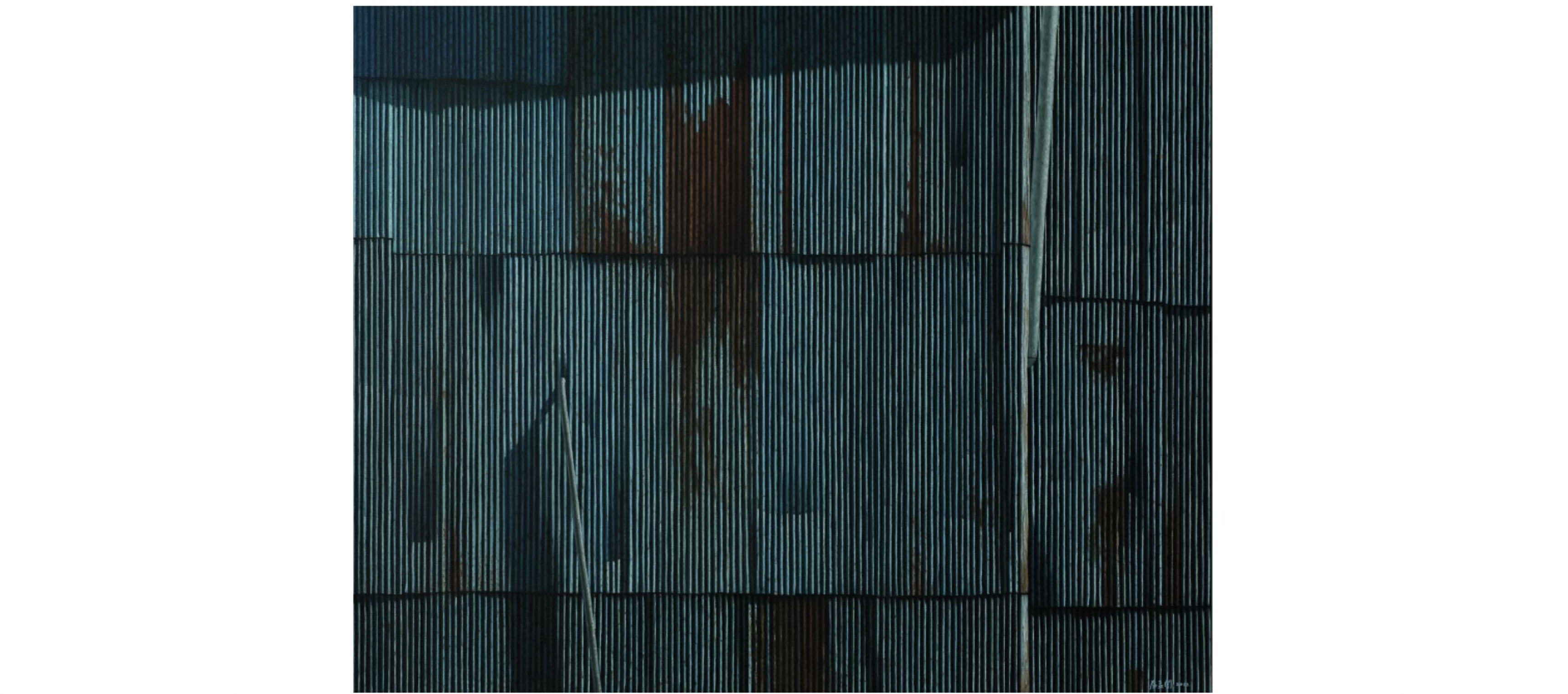 「很多人都說鐵皮屋是台灣景觀的殺手,但我真的有看過很好看的鐵皮……不是說設計的很好看,就是他拼拼裝裝的斑斕很好看。」蔡孟閶一系列以鐵皮屋為主題的作品,在畫面上以單色系的鐵皮牆面為主題,以寫實的筆法記錄下鐵皮上隨著歲月出現的鏽斑與印痕。「我覺得鐵皮是最能代表台灣的,因為他反映台灣島民的資源其實很少,所以必須用這種花最少的錢,最短的時間就能蓋工廠的材料。」對蔡孟閶而言,鐵皮不僅僅是簡陋的房舍,更是小人物在城市急速擴張下,以自身小小的力量努力撐起生活的象徵符號。蔡孟閶以機械般的反覆筆觸描繪出鐵皮的波浪光影,猶如一場與勞動者並肩,日復一日踏著重複步伐的修行。 漂泊的心:鄉愁與尋根的渴望 「遷徙」一直以來都是生物為了生存所產生的必要移動。因「遷徙」所產生的情緒則可稱為鄉愁,鄉愁一直是台灣藝術史上,諸多藝術家探索的一個主題,從戰後來台藝術家對彼岸土地的鄉愁到台灣藝術家對在地記憶的探索,縈繞的是人們漂泊無以落地的心。因為感覺未落地,因此更加需要一個緬懷之所。在鄉愁之前,究竟何為家鄉?是自己生長的土地為家鄉,還是祖先一步一腳印落下汗水的屋舍為家鄉呢? 嘉義對蔡孟閶而言,是一個感覺略有些複雜的地方。阿公是布袋人,後續則因應都市發展的工作機會,搬到嘉義定居。蔡孟閶則因為父母前往高雄打拼,自幼生長於高雄,高中時因考入嘉義高中美術班,度過為期三年的住校生活。那時的嘉義對他來說是一個暫居之地,是乘載了兒時歡快記憶,以及高中男校青春自在的城市。大學時他再度返回高雄,並開啟以高雄這塊土地為主題的創作。約莫在2016年蔡孟閶決定搬回嘉義與其他親戚居住,離開自幼成長的高雄,對他來說是一個巨大的變化,一棟房子上上下下住著親戚的生活型態,也讓蔡孟閶對嘉義的情感日漸複雜,與過去相對明快的青春不同,參雜了更多柴米油鹽的煙火氣。 「2016年剛搬到嘉義時,其實很不適應,因為需要和大家族同住,所以我有時會一個人回到高雄以前工作室的樓下,看著以前熟悉的店面與街道,再默默地回到嘉義」蔡孟閶笑著說。應對遷徙所產生的衝突感,蔡孟閶以追尋家族記憶應對,《家》與《脈》系列是家族的過往,是即將被遺忘的記憶碎片,用畫筆將那些隨著長輩過世已經逐漸被遺忘、販售的過往一一拾起,試著從裡面長出屬於自己在這片土地的根系。 系列《脈》是2018年蔡孟閶前往布袋工作時開啟系列創作。家族出身布袋的他藉著此次機會重新爬梳了家族故事與兒時記憶。他回憶著「我阿公他們以前是賣魚,肩上挑著五、六十斤的擔子,捕到魚後就一路小跑到嘉義東市場,然後賣完後再走到朴子搭五分車回家。」這段描述聽起來簡單,但打開地圖就能發現那是一段肩擔重物超過30公里的遙遙長路。後來因為嘉義市區蓋起磚窯廠,許多布袋漁民決定進入都市工作,而阿公一家也不例外的遷入市區,至今嘉義市區仍有以磚磘為名的地名。透過用身體在布袋反覆行走,蔡孟閶藉由創作建立與祖先、與嘉義這塊土地的記憶連結,讓自己能更靠近這個有些陌生、有些壓力的居所。透過將記憶與生活的感想混進顏料,用一種極為冷靜平穩的方式描繪呈現,與其說這是對家的記憶,不如說它是一座試圖重新將自己與嘉義這塊土地,以「家」一詞聯繫起來的橋樑,也是蔡孟閶對高雄鄉愁的弦外之音。