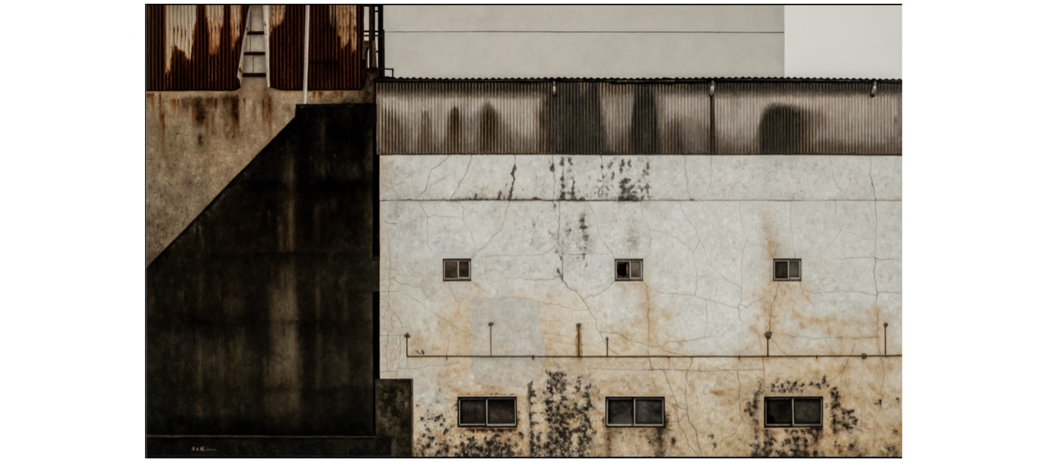 18世紀在英國興起的壯遊(Grand Tour)風潮,讓描繪風景的型態多元起來。昔日畫家應貴族士紳要求,以地誌景觀(Topographic Views)的手法描繪鄉間豪宅與地產的的景物肖像,如今描繪所見景觀的風景繪畫亦隨著壯遊興盛。隨著18世紀末工業革命興起,城市與鄉村的差異加大,對城市的風景描寫也毫不顧忌地將現代化設施納入,都市的邊陲則發展出介於城市與鄉村的聚落風景,例如遠離現代城市巨獸的楓丹白露林就孕育出以大自然為主要題材的巴比松畫派。至此風景畫從昔日神話的背景裝飾,搖身一變成為人類文明發展與文化活動的見證者、現代發展進程的產物與軌跡。Kenneth Clark在《風景入藝(Land scape into Art)》中便認為風景畫是19世紀這個工業與科技發展飛速的時期裡,最主要的藝術表現形式。 在都會發展迅速的今日,蔡孟閶便是當代捕捉著城市邊陲景色的藝術家。他關注的是人們未曾留意的城市一隅,那些在歷史的洪流中無法被留下的碎片記憶。俗話說凡走過必留下痕跡,那些未來會隨著拆除被遺忘的痕跡,被蔡孟閶描繪保存,讓人們數年的行走坐臥在畫面上被濃縮呈現。以畫面空無一人的方式呈現人的生活軌跡,透過描寫這些記憶中的場景,蔡孟閶以自身的情感與這片土地發展的歷史樣貌產生共鳴。 從遠眺到近觀:壁畫經驗的轉變 高雄與嘉義,是蔡孟閶作品中重要的兩座都市,一個是生長的家鄉,另一個則是同時承載家族記憶與掙扎,以及高中無憂時光的所在。「從小其實就跟工業就有各式各樣的接觸,國小的時候住在楠梓,在煉油廠加工區長大,從我們家的巷子口看出去就是煉油廠」在蔡孟閶的自述中,工業與工廠一直是他成長記憶的一環。在那些飄雨的日子甚至會聞到一些偷放廢棄物的味道,空氣中瀰漫的微酸的氣味,搭配巷子口望去的煉油廠是最鮮明的記憶,也成為他大學時期的創作主題。 蔡孟閶這個時期的作品與新地景攝影(New Topographics)有些相似,將日常記憶以冷冽的視角呈現。構圖幾乎都是以水平式的構圖為主,刻意模糊掉透視線與雜物,只將重點放在工廠,並營造霧濛濛中遠眺的模樣。齊整的地平線與垂直矗立的工廠,是沿路從所居住的楠梓一路向北邊的台南前行,到橋頭、岡山所望出去的景觀,介於兩個都市之間的區域,也是蔡孟閶過去經常踏足遠眺的地方。「我喜歡製造反差跟反諷」蔡孟閶表示,「工廠是一種很雜亂、高大、吵雜的東西,所以我刻意把視線壓低」。從2006年到2008年間的《工廠系列》中,可以看到他對視線做的處理,化繁為簡讓畫面產生置身事外的抽離感。 2008年蔡孟閶便以《工廠系列》參加高雄獎獲得「觀察員特別獎」,高雄獎於2007年開始設定觀察員機制,透過不具投票權也不介入評選的觀察員,在審議中參與討論,並在觀察後提出全面性的創作現象報告。在卡通與漫畫主題蔚為風潮的年代,蔡孟閶堅定地以低飽和的色調,平靜緩和的敘事語言建構他的城市記憶。