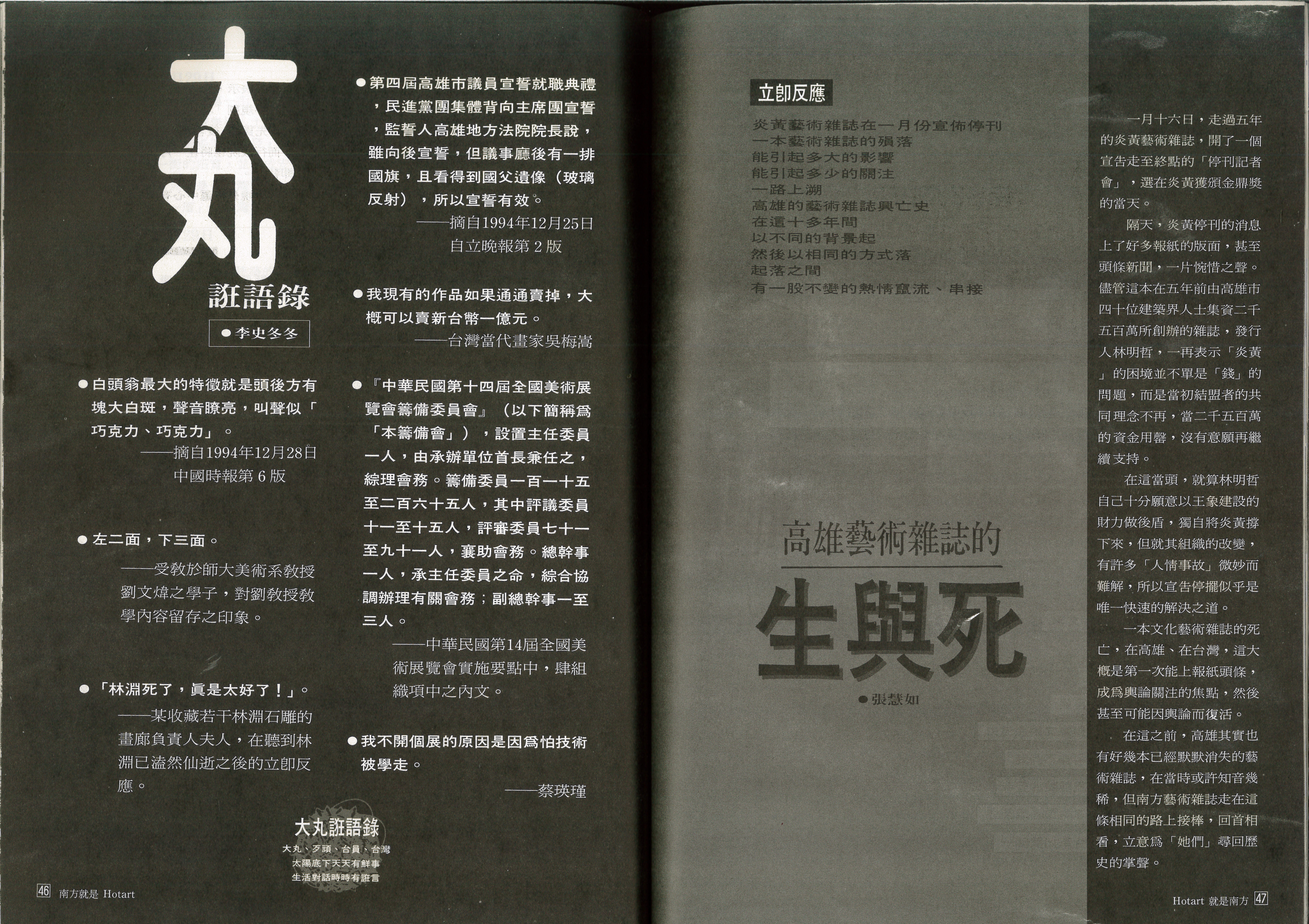 有齜牙裂嘴,怒目圓睜;有豔麗嫵媚,婀娜多姿;有鬼靈精怪,活靈活現;有神秘詭異,深不可測;有睥睨一切,傲視全場;或紅色白點、或綠底白點,還有紅綠黃等色彩圖形的變化;這些「變色龍」可以依展場的環境吊掛牆上、分布地上,營造出熱帶叢林詭異又奇幻多彩的氣氛。而參觀者,就如同誤闖森林的小白兔,小心翼翼地進入這個特別的國度,面對這麼多雙來自四面八方的眼睛,起初會有些不知所措,但馬上又將被每個個體的鮮豔色彩及姿態吸引得目不轉睛,激發內心最原始的愉悅。 許自貴的《變色龍》系列(又名《牆上的龍》),與其它階段的作品最大的不同,是拋棄了原先常賦予作品的沉重社會批判,單純專注於形與色的美感追求。於是整個作品顯得輕盈自在,彷彿過去鬱積的不滿都在此時煙消雲散,而更細緻的雕琢、更精心的色彩調配,讓作品的生命力鮮活熾熱。創作者在創作此系列時正步入五十大關,對於青春不再的感懷,反轉為追求創作上青春活力的再現,使得技巧表現與過往有著顯著的改變。 此系列紙漿作品的身體骨架,都是以瓦楞紙板為主體作成,腳與尾部再以鐵絲彎曲成弧度的變化。過去藝術家的創作往往較有計畫性,事前會先構思好內容;而變色龍系列的創作過程則隨性多了,即興的創造力與想像力凌駕一切,順著感覺走。藝術家自述,在創作之初便會先設定此隻變色龍的性別與個性,再依此特性逐步發展。因此才會有千姿百態神情互異的百餘隻變色龍,組成龐大的藝術家族。 許自貴最初的創作發想雖然來自書展的變色龍圖錄,也確實研究過其前、後腿與肢體之結構;但真實的變色龍為「生物」的生命,藝術家創作的變色龍卻屬於「藝術」的生命。變色龍最重要的感覺是「視覺」,藉此得以覓得食物。許自貴在此系列開始以玻璃珠強化眼睛的靈活表現。 紙漿創作可以慢慢斟酌後往上附加,再以美工刀或鋸子細細琢磨。並運用四種粗細不一之規格的吸管,逐步壓印在變色龍身體成為鱗片的紋路;待紙漿乾時,紋路的凹凸效果會更加明顯。著色則根據變色龍的特性,公者多藍、綠等色調,母者當然就有瑰麗的紅、橘或柔美的粉色系等色調;另亦有年幼與年長之分。 總之,斑斕耀眼的色塊圖案加上造形組合的千變萬化,許自貴很驕傲地說:每一隻都完全不同。最後上的基底塗料(Gesso),取代了過去使用的石膏水,附著力強且可保存原來的肌理。完成的變色龍只要成雙,即可形成對話的趣味;多隻則營造出言語難以形容的多重互動與氛圍,奇幻世界已然誕生。 從學生時期許自貴就自認具有獨特的「色感」;以油畫第一名的優異成績畢業於台灣師大時,畫作中色彩層次的明麗多變即表露無遺。出國留學時改習雕塑,對於「繪畫」與「雕刻」兩者之間關係的重新探討,讓許自貴的創作進入新的里程。剛開始是因美國的材料昂貴,許自貴從垃圾分類中引發利用隨手可得的「紙」作為創作材料的想法,開啟之後的紙漿創作。一般雕塑偏重造形與材質,無法滿足許自貴對於色彩表現的強烈欲望,於是自創「立體繪畫」,將二者緊密結合。 真實世界的「變色龍」可以因著溫度光線或環境的不同而改變體表的顏色,帶給人多彩而神秘的印象;藝術世界的「變色龍」同樣有此特性,卻更超越真實理性的範疇,無拘無束地展現著各種形色變換組合的可能。無論男女老幼,只要準備好一顆最單純無飾的心,都可乘著想像的翅膀,感受到變色龍藝術國度的奇異能量!