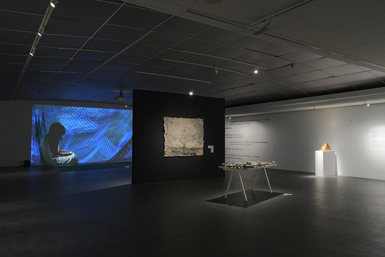 海洋串連起分離的土地,也孕育了無數的生命。“Tawid Dagat”是一句源自菲律賓的片語,意味著「跨越海洋」,象徵全球化時代跨文化交織、流動的資源體系。本次個展展出妮可萊・布恩迪亞・古皮特自 2021 年以來的十五件代表性作品,開展關於水與氣候危機、當代菲律賓離散經驗,以及全球系統的批判性對話。 妮可萊・布恩迪亞・古皮特是一位菲裔美籍跨領域藝術家。出生於美國加州洛杉磯,她的父母於1970年代因貧困與政治動盪自菲律賓移居美國。自幼隨著家人居住於菲律賓和美國兩地,在跨文化的成長背景下,她的創作層層拆解、探討與交織這段家族離散的歷史,從個人的經驗出發,輻出菲律賓海外移民的廣泛現象。〈相思樹的夢〉、〈哀悼家族之樹的逝去〉、〈母親的橫渡〉不只是對於自我與原生性的尋根和追憶,也是對於移民身分認同的探索。在這些作品中,馬尼拉蕉麻作為紙漿的基底,是一種西班牙殖民菲律賓時期培育的原生植物,而後銷往美國作為經濟作物。相對應的,作品融合了人工社會的產物,樂透彩券紙象徵著遷移是一場賭注、影印紙徒勞地復刻著原鄉的復刻影本,在失落的探尋之餘,也是對於「美國夢」詩意的自我批判──只要努力付出,無論種族或其出身背景,終會得到財富的迷思。 這樣的批判,也隱含在全球南方視角下其探討與菲律賓的「水」有關的系列作品。藝術家化身行動者,〈豐饒中的匱乏時代〉凝結了河川及湖泊水系污染的碎片,〈颱風倖存者〉、〈浮出水面的故事〉及〈我鬆開了大海〉從重大天然災害事件,看見整個氣候系統中的失衡。這些透過水作為主體的創作,在在訴說了島嶼的傷痕,以及人們因此被迫遷徙的故事。正在這些仍然正在上演的環境悲劇,叩問著什麼是在過程中被犧牲的?什麼又是相對重要的?對於價值的權衡與選擇、自然的掠奪、勞動力的剝削,也反映在其以「金」作為視覺質感的作品〈鹹水〉和〈金、銀、死亡〉,玩味地展現人們對於物質的執迷,也反映了提問著水/黃金所象徵的非固定價值。 水體的能動性貫穿了整個展覽,在其最新的系列作品〈也許可能〉與〈潮織〉中的編織與纏繞,一張張抽象的網,串連起家族記憶、勞動的身體及即將失傳的文化傳統。這樣的行動既是生命的溯源,也是一種自傳式的的扣問。〈好運〉以紙與陶土翻製的私人物件,作為菲律賓移工赴臺工作的故事載體,成為缺席之物的代替符號。這些與移動有關的故事,匯聚了本次展出作品的概念,從生命水體、文化根源、到全球資本體系的交換。如同〈我們聚集、我們記憶、我們獻祭〉一作,四散的果物、無法延續的宴席,宛若分裂的土地,只有透過彼此之間的汪洋聯繫著。這樣的遷移與擺渡,是地理空間的跨越,也是藝術家透過創作在漫漫生命時光長河中的深情橫渡──直到相愛的人們有朝一日,在海的另一端再度重逢。 (文|吳念澄,高雄市立美術館助理策展人)