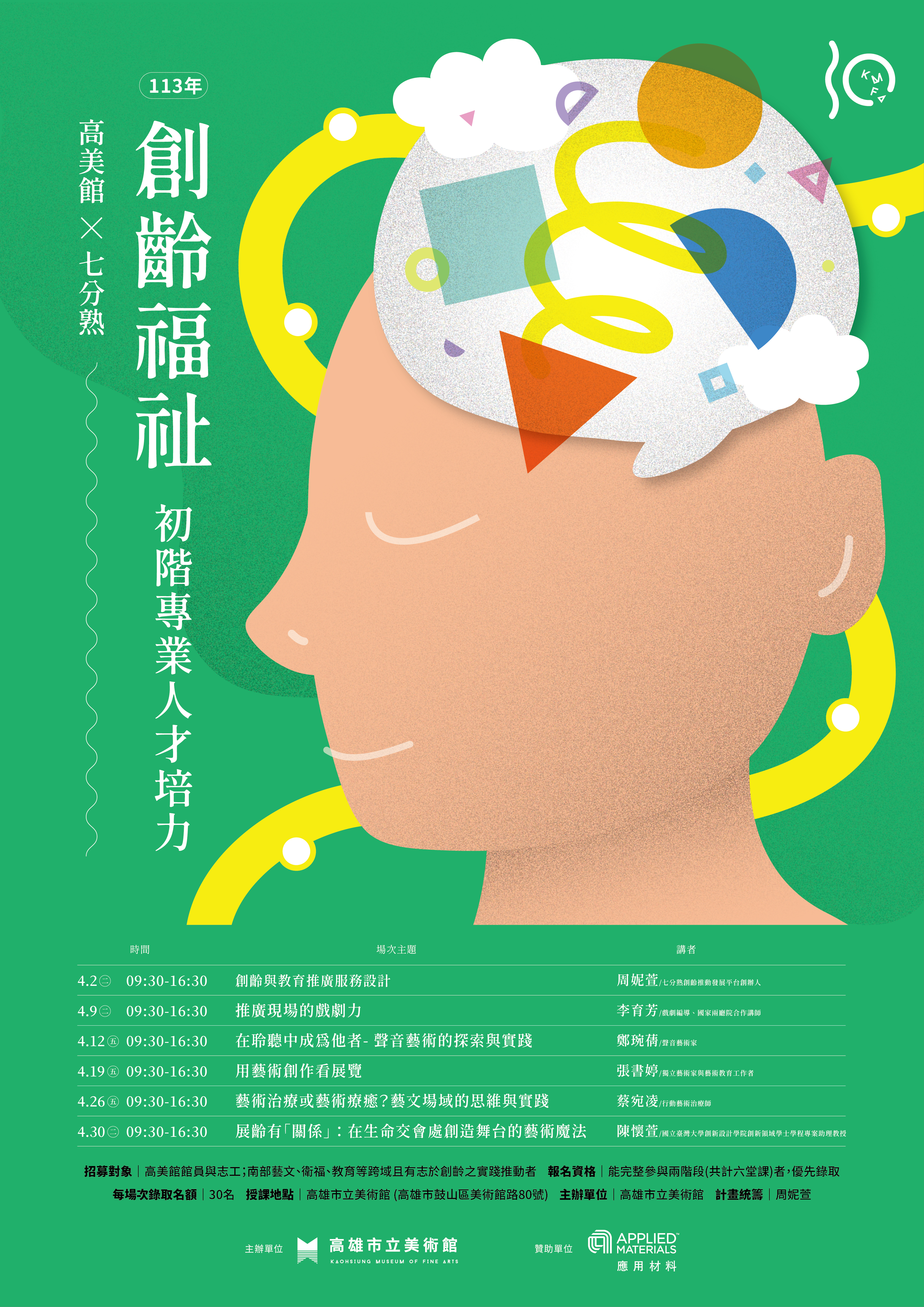 本系列工作坊以培養高雄市立美術館為基地的創齡跨域專業人才為目標,藝術推廣的協作與同理為主軸,發展出具「美術館創齡福祉」和「教育推廣服務設計」的系統化課程,建立以美術館為資源的藝術推廣運用可能,落實美術館成為每個人長大變老路上,維持身心健康與幸福感的重要關鍵。歡迎來自衛福醫療、社會照顧、高齡長照、藝文教育等,有志於投入創齡實務者,懷抱開放、平等、創新的一顆心,與我們攜手同行。